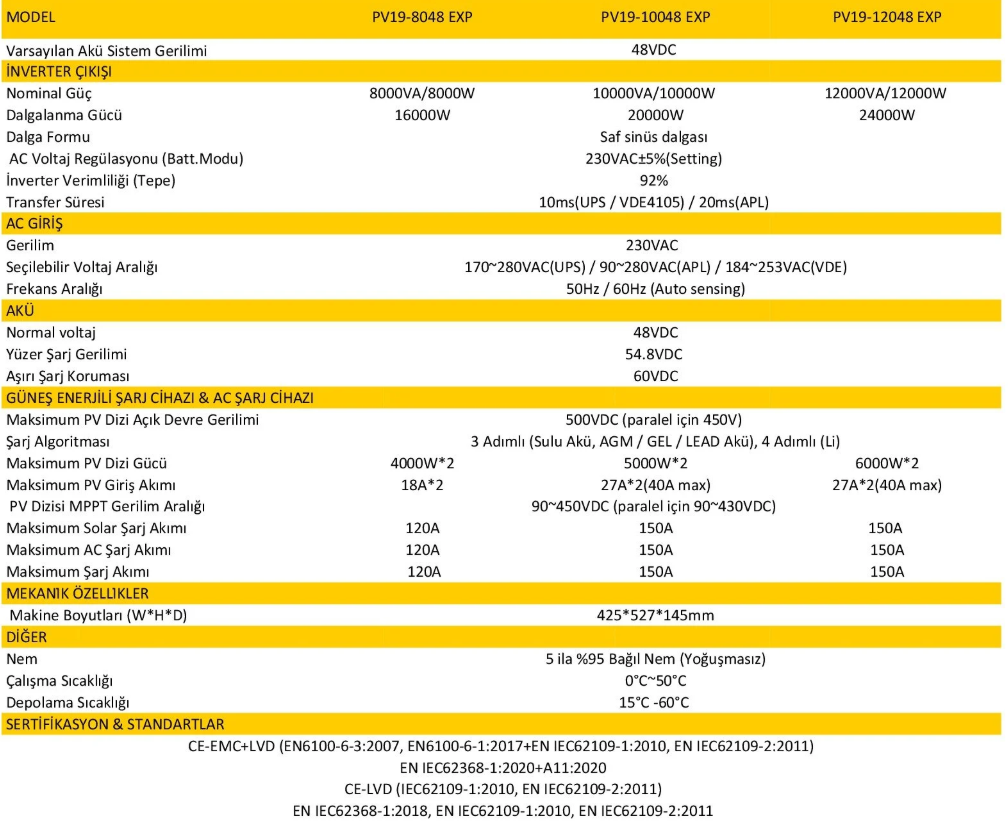 PV1900M EXP, invertör, MPPT güneş şarj cihazı ve akü şarj cihazı işlevlerini bir araya getiren çok işlevli bir invertör aynı zamanda şarj cihazıdır kesintisiz güç desteği sunar. PV1900M EXP Serisi batarya olmadan da çalışabilir. Maksimum PV giriş voltajı 500V'a ulaşabilir ve MPPT voltaj aralığı 90~450Vdc'dir. Dahili iki MPPT güneş şarj kontrolörü ile müşterilerin güneş enerjisini tam performansta kullanmalarına yardımcı olur.