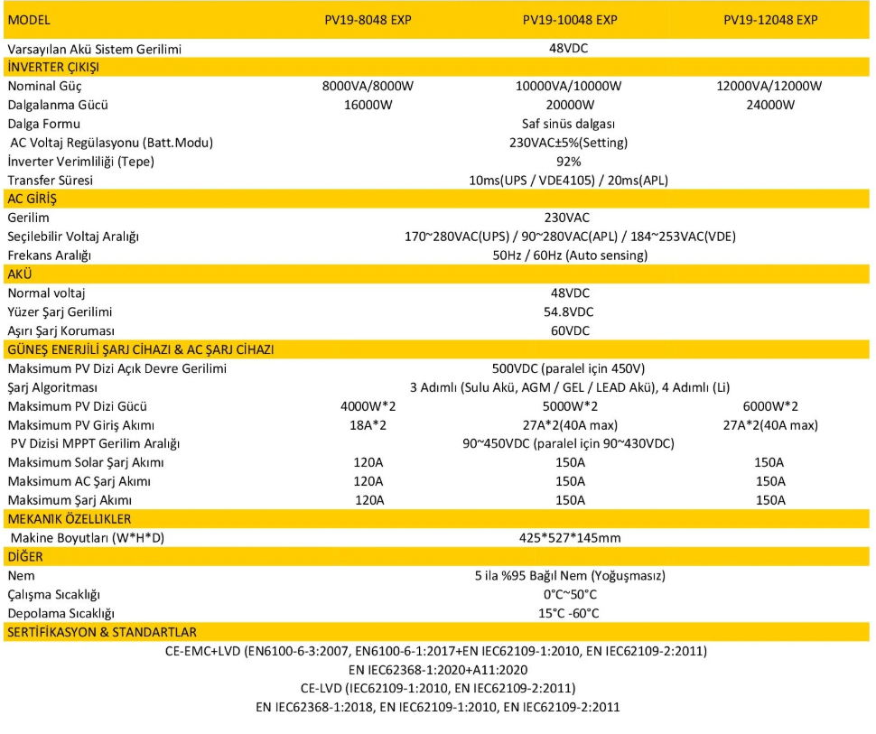 PV1900M EXP, invertör, MPPT güneş şarj cihazı ve akü şarj cihazı işlevlerini bir araya getiren çok işlevli bir invertör aynı zamanda  şarj cihazıdır  kesintisiz güç desteği sunar. PV1900M EXP Serisi batarya olmadan da çalışabilir. Maksimum PV giriş voltajı 500V'a ulaşabilir ve MPPT voltaj aralığı 90~450Vdc'dir. Dahili iki MPPT güneş şarj kontrolörü ile müşterilerin güneş enerjisini tam performansta kullanmalarına yardımcı olur.