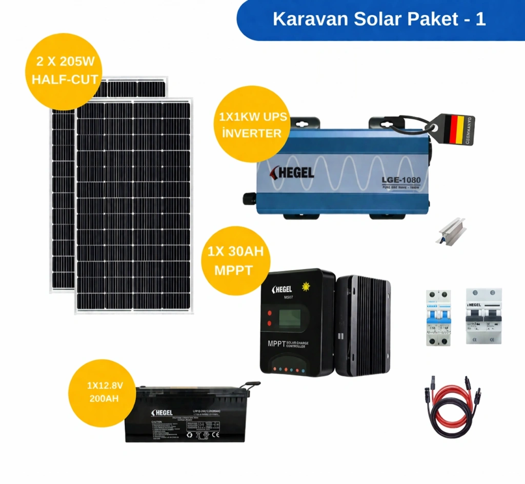 Karavan Solar Paket – 410W (2x205W) Güneş Paneli + 1KW UPS İnverter + 200Ah LiFePO4 Akülü Off-Grid Enerji Sistemi